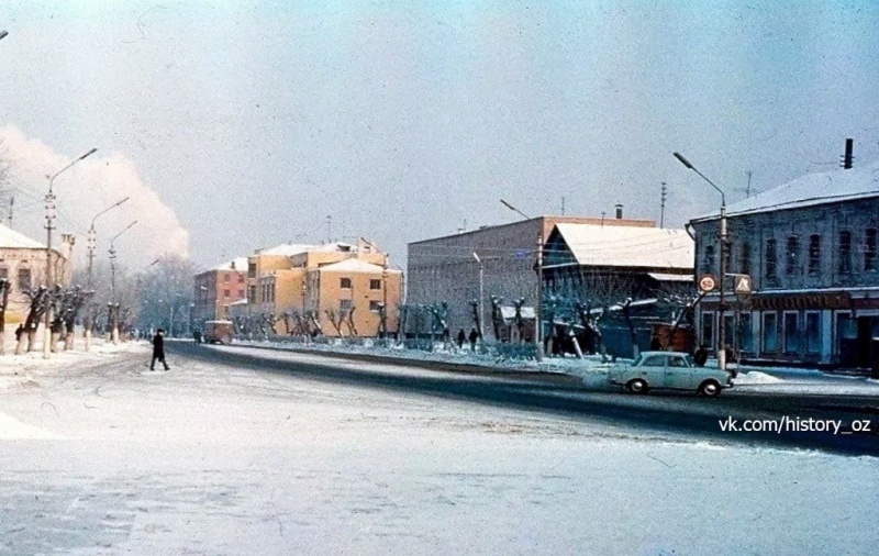 Морозный денек на улице Ленина в 1986 году. Начало улицы Ленина, ж/д поликлиника, банк, а слева еще не разрушенная старая типография....