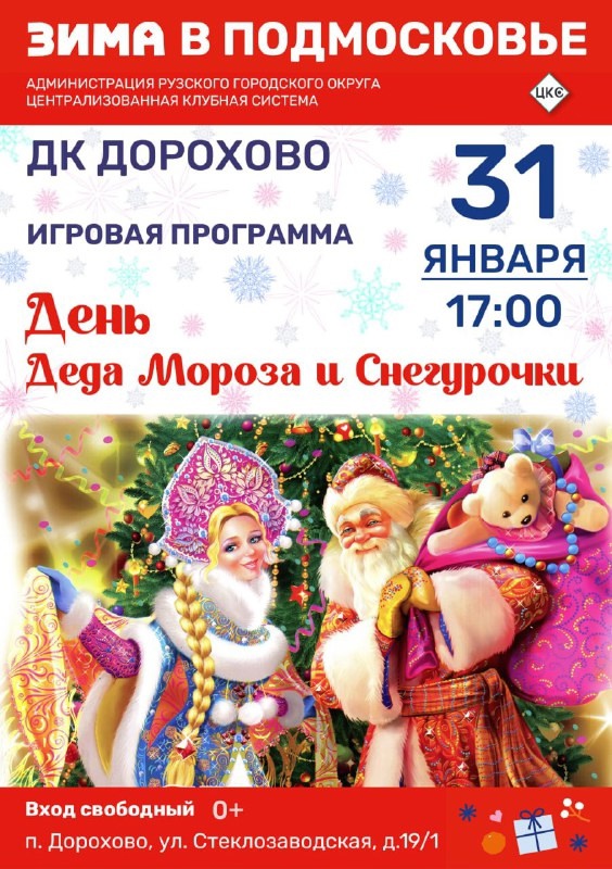 Дом культуры Дорохово приглашает на игровую программу «День Деда Мороза и Снегурочки» 31 января в 17.00.