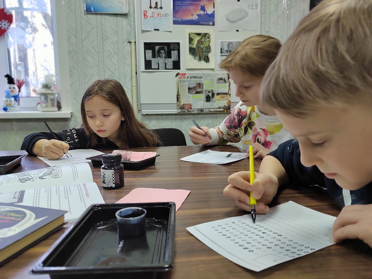 На одном из уроков юные читатели тренировались писать перьевыми ручками и чернилами, соблюдая все правила нажима. С каждой линией буквы у ребят получались все лучше и лучше.