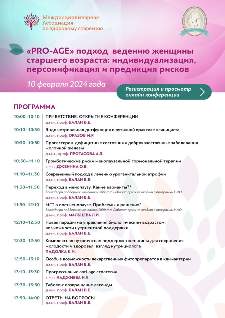Научно-практическая конференция «PRO-AGE» подход ведению женщины старшего возраста: индивидуализация, персонификация и предикция рисков 10 февраля 2024 г. будет сосредоточена на подходе «PRO-AGE», который предполагает значимую роль гинеколога в профилактике рисков развития заболеваний у женщин зрелого возраста.