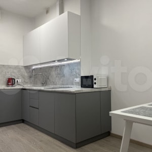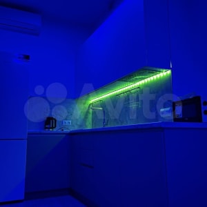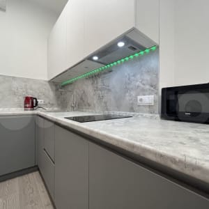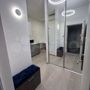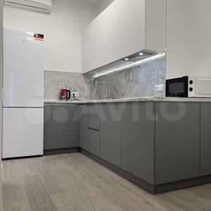В коридоре расположен большой вместительный зеркальный шкаф. На кухне имеется вся необходимая мебель (стулья также закуплены, ожидается доставка) и бытовая техника (холодильник, электрическая плита, вытяжка, микроволновка, чайник, кондиционер), подключено интерактивное освещение.